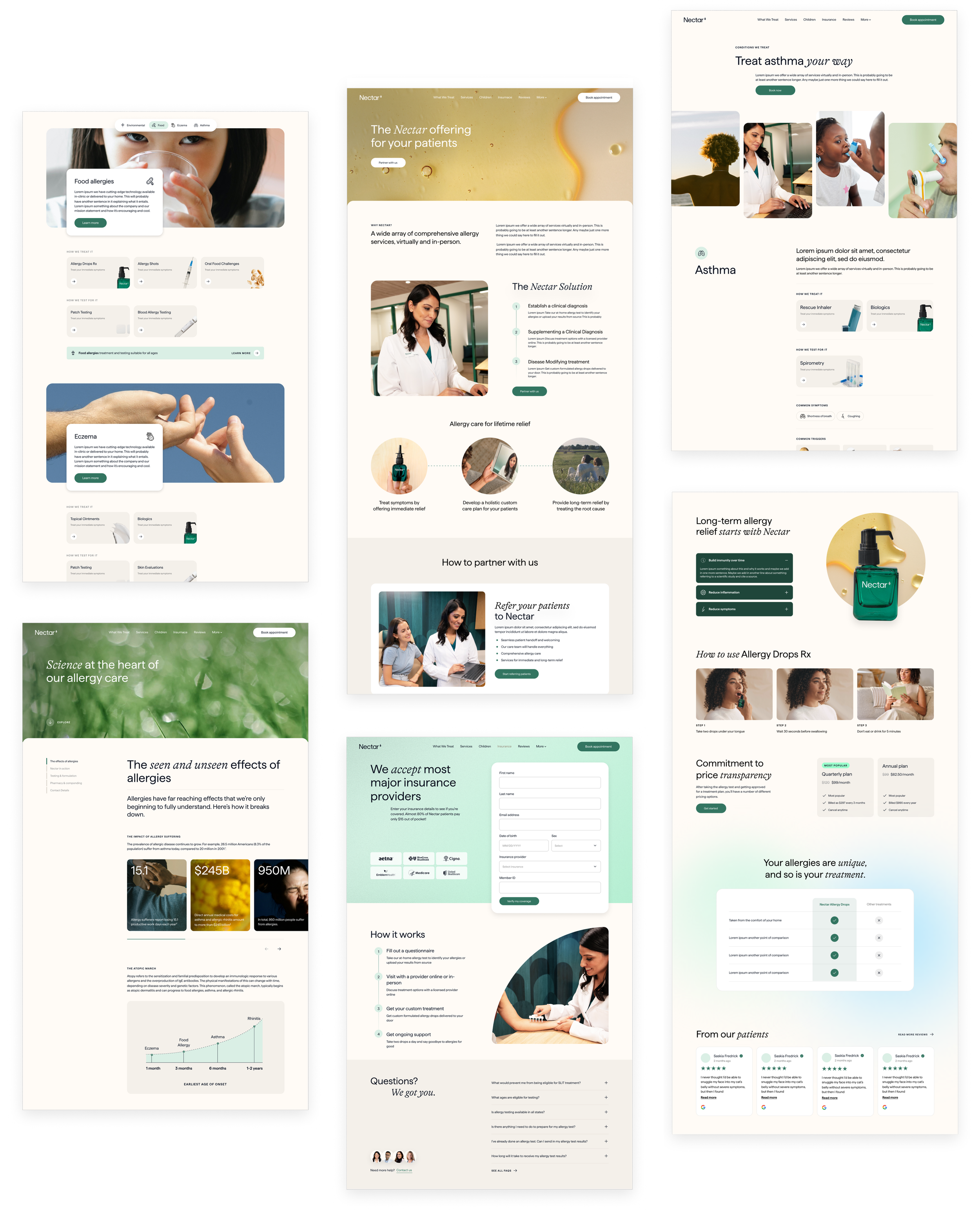 Nectar was shifting from a telehealth-only model to a hybrid platform, connecting allergy sufferers with expert care both online and in person. To support this evolution, we redesigned their website with a new information architecture, an updated visual language, and a clear presentation of their expanded services.